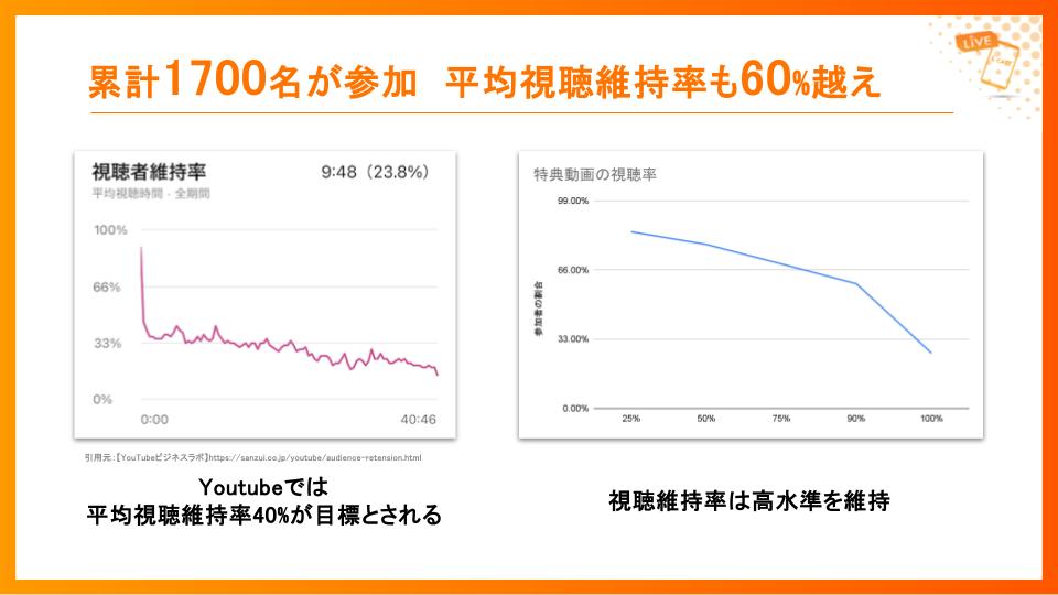 一般的にYouTubeの動画の平均視聴維持率は、40%が目標とされています。それに対し、Lキャストで配信した動画の平均視聴維持率は、60%超でした。