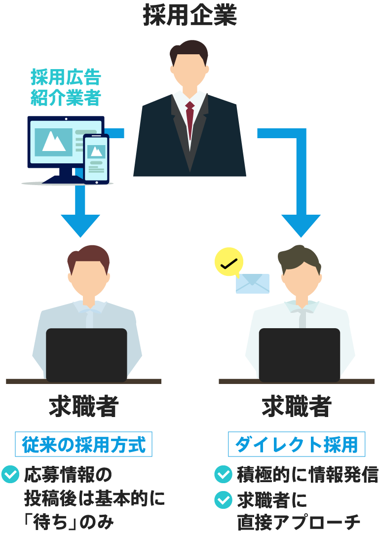自社に合う人材を第三者サービス(紹介業者、求人広告)に頼らず直接コンタクトを取ってスカウトする採用手法です。