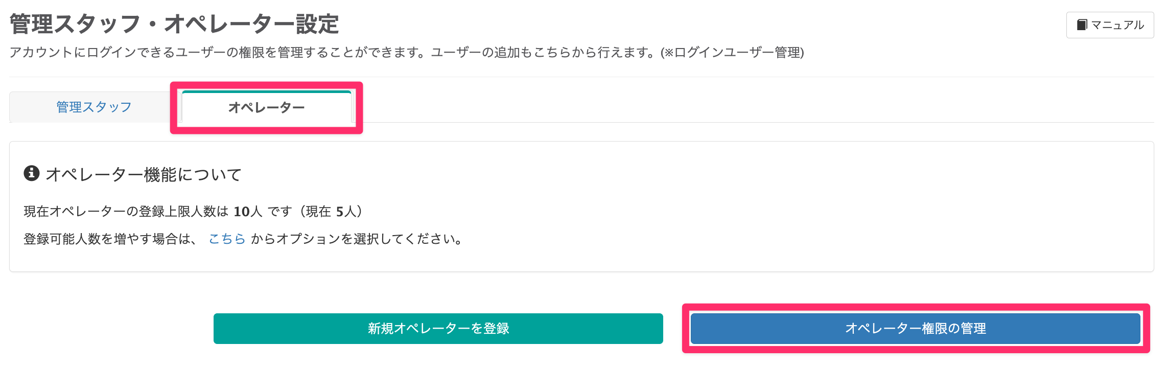 オペレーターを登録したい場合は、オプションを購入していただく必要があります。利用料金は登録できる最大人数によって異なります。