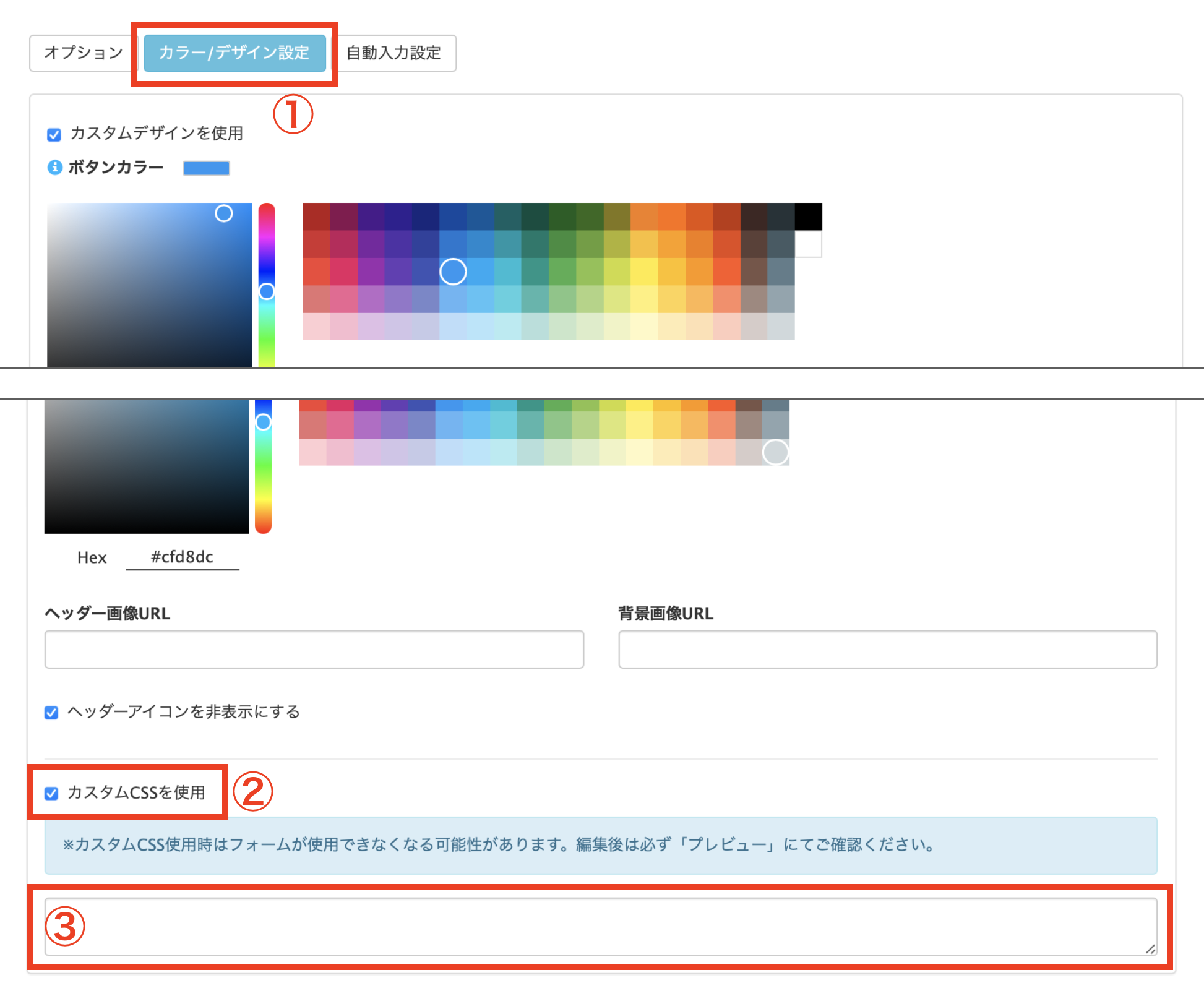 CSSを使いたい回答フォームを開き、下部の「カラー/デザイン設定」をクリックします。