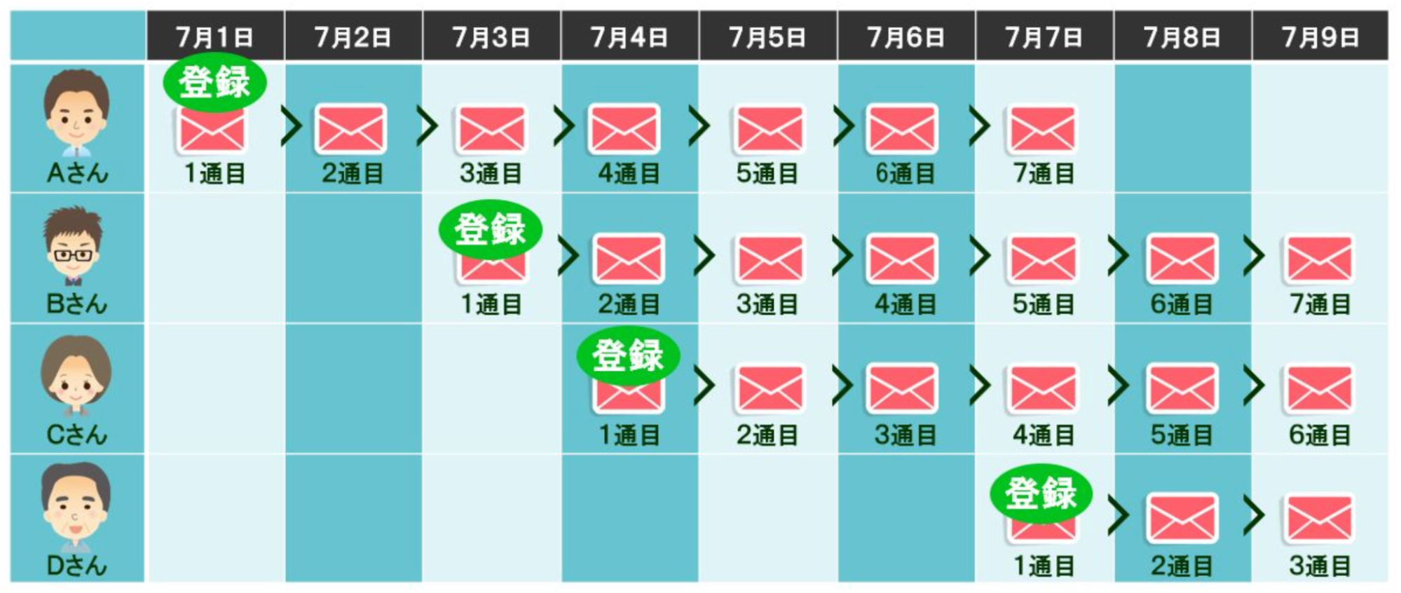 シナリオ配信(ステップ配信)とは、あらかじめ準備したメッセージを指定したタイミングで自動的に配信する機能です。