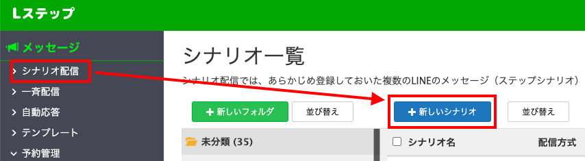 シナリオ配信(ステップ配信)>シナリオ一覧画面を開き【+新しいシナリオ】から作成開始してください