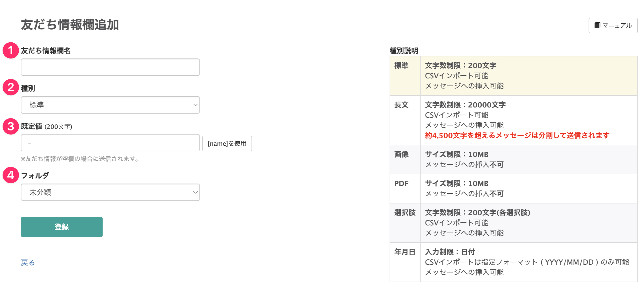 Lステップ管理画面>友だち情報欄管理>【+新しい友だち情報欄】ボタンをクリック>以下の4つの項目を設定してください