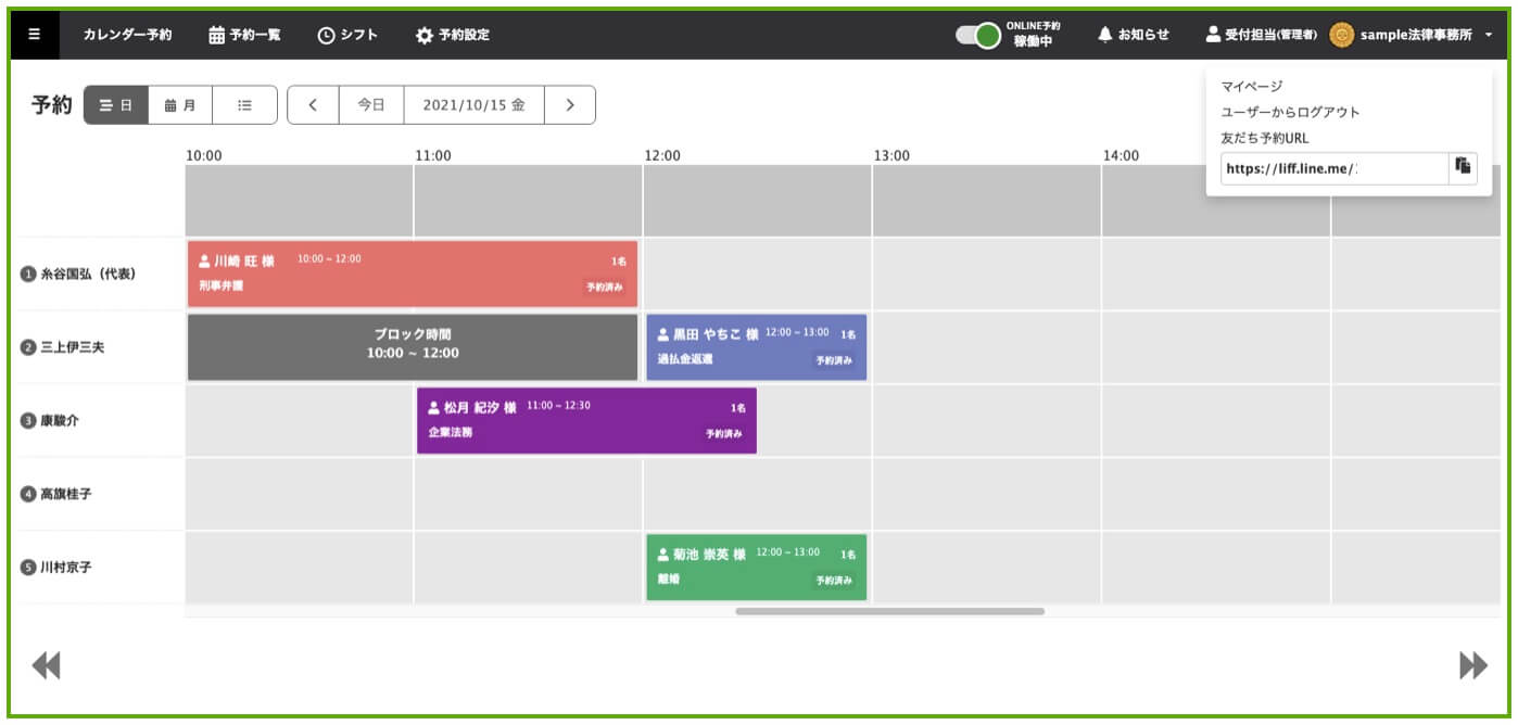 ②スタッフの予定ありの時間帯は「予約不可」として、管理画面でシフト表が自動生成されます。