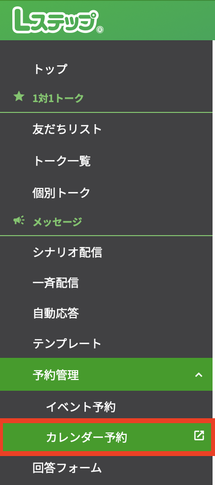 Lステップ管理画面の左メニュー内「予約管理」>「カレンダー予約」をクリックして設定を開始してください。