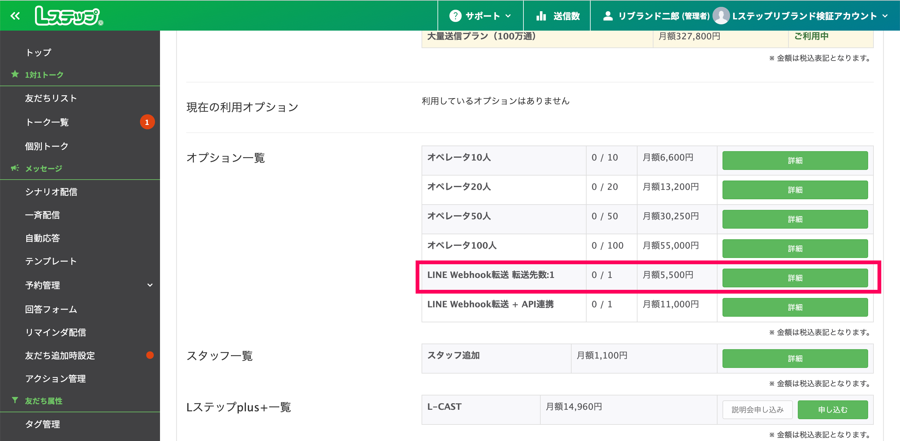 Webhook転送機能は【有料オプション】で、契約アカウント毎に月額費用:5,500円(税込)必要です。
