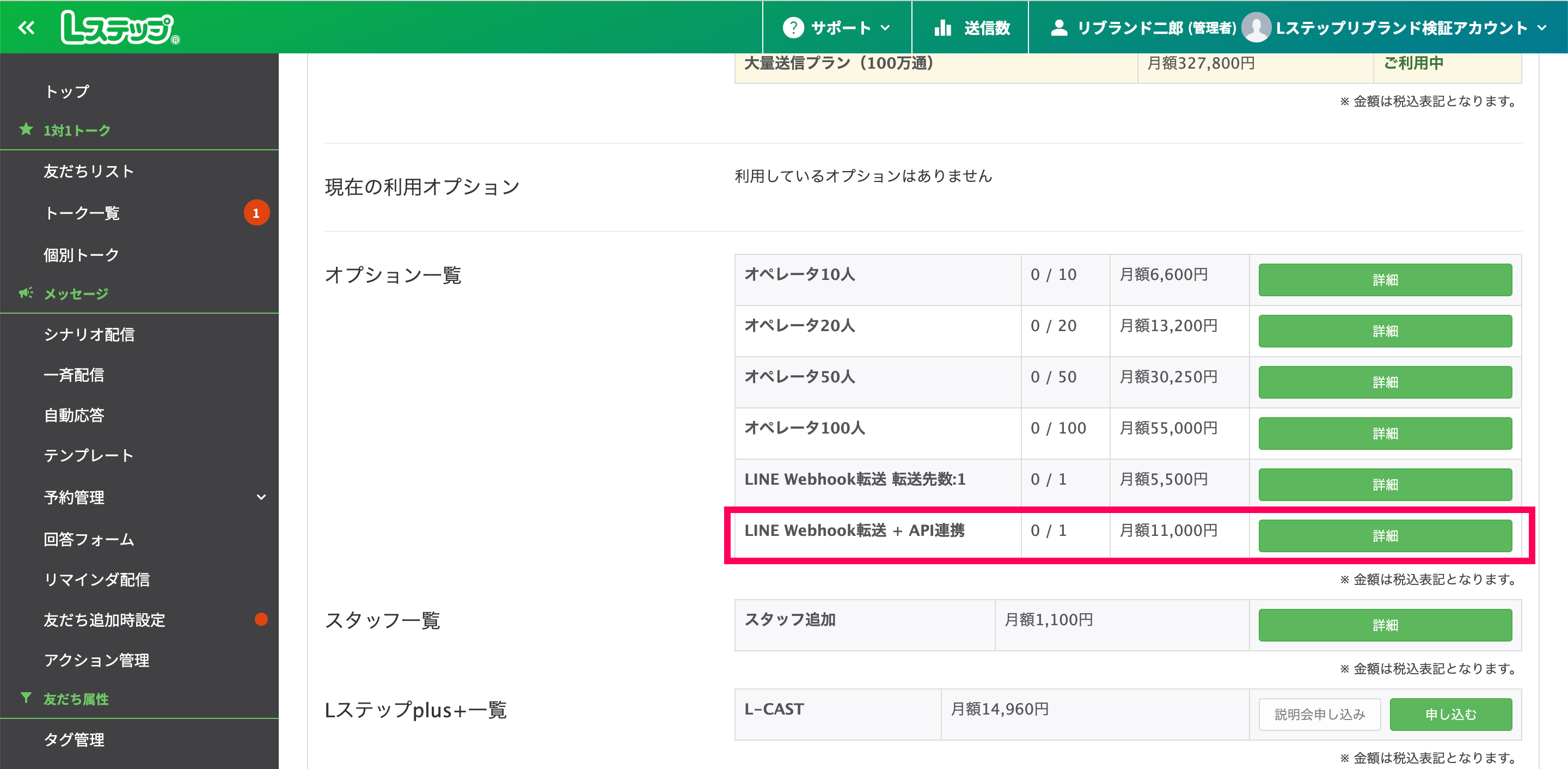 ※すでにwebhookをご利用中の場合は、追加料金 月額5,500円(税込)でAPI連携をご利用いただけます。