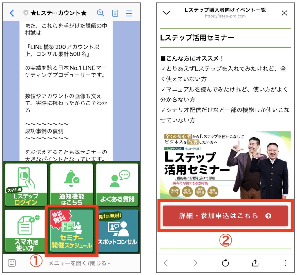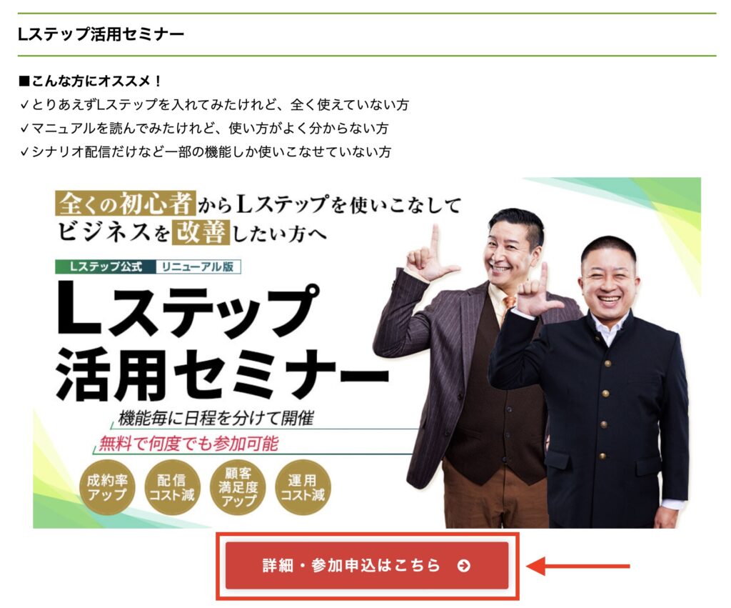 ②Lステップ活用セミナーの「詳細・参加申込はこちらボタン」をタップ。