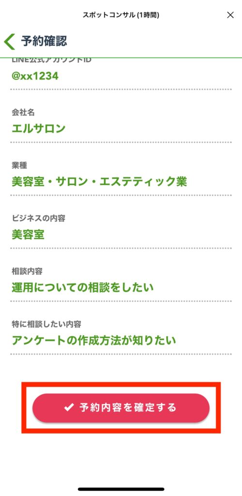 LINE公式アカウントのIDや、ビジネスの内容を入力します。詳細に記入いただけますと、より具体的な提案をさせていただけます。