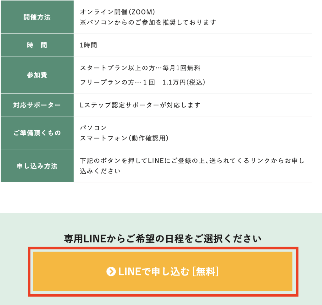 管理画面で「Zoom個別相談」をクリックし、次ページの「LINEで申し込む(無料)」をクリック。